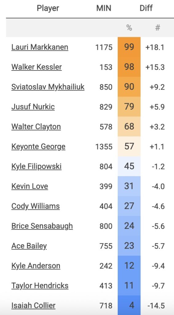 There are only five active Jazz players this season that are having a positive impact on the team’s scoring “differential” (efficiency differential1); that is, the points the Jazz score during a game (100 possessions) compared to what their opponents score. Those players are (see table to the left) Lauri Markanenn, Svi Mykhailiuk, Jusuf Nurkic, Walter Clayton, and Keyonte George. The rest are negative. Sit one of these positive players and replace them with a negative player and you’re more likely to lose—that’s what the numbers tell you.